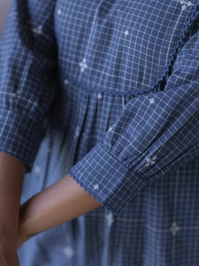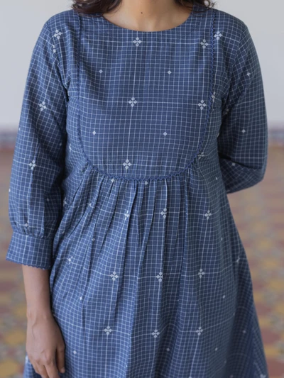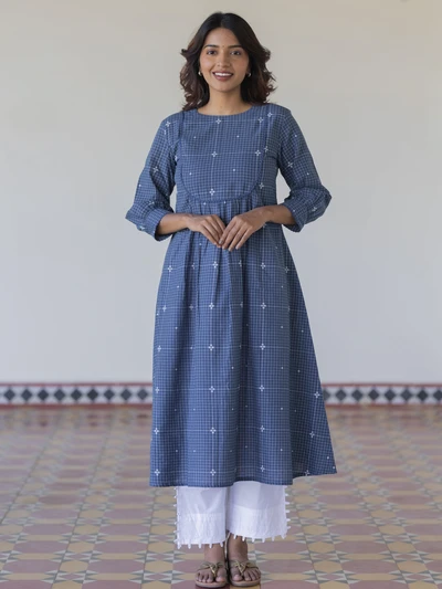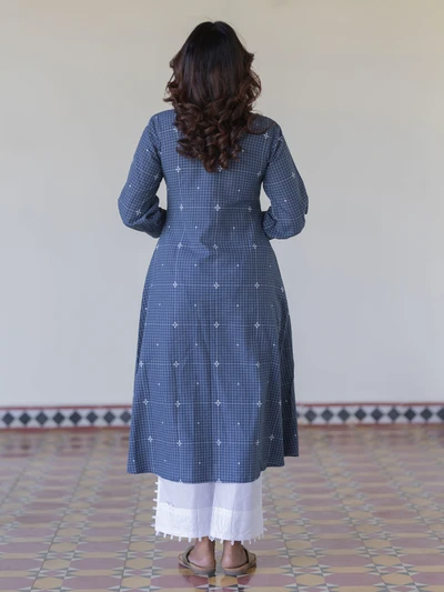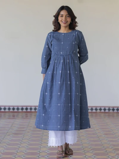 Navy Handloom Checkered A-Line Kurta