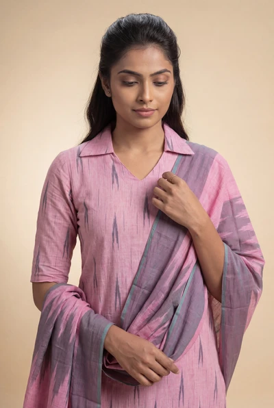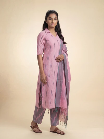 Pink Smoke Ikkat Kurta Set With Dupatta